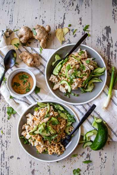 - Divide the noodles on to plates, top with chicken, sliced cucumbers, sesame seeds, green onions, or cilantro if desired.